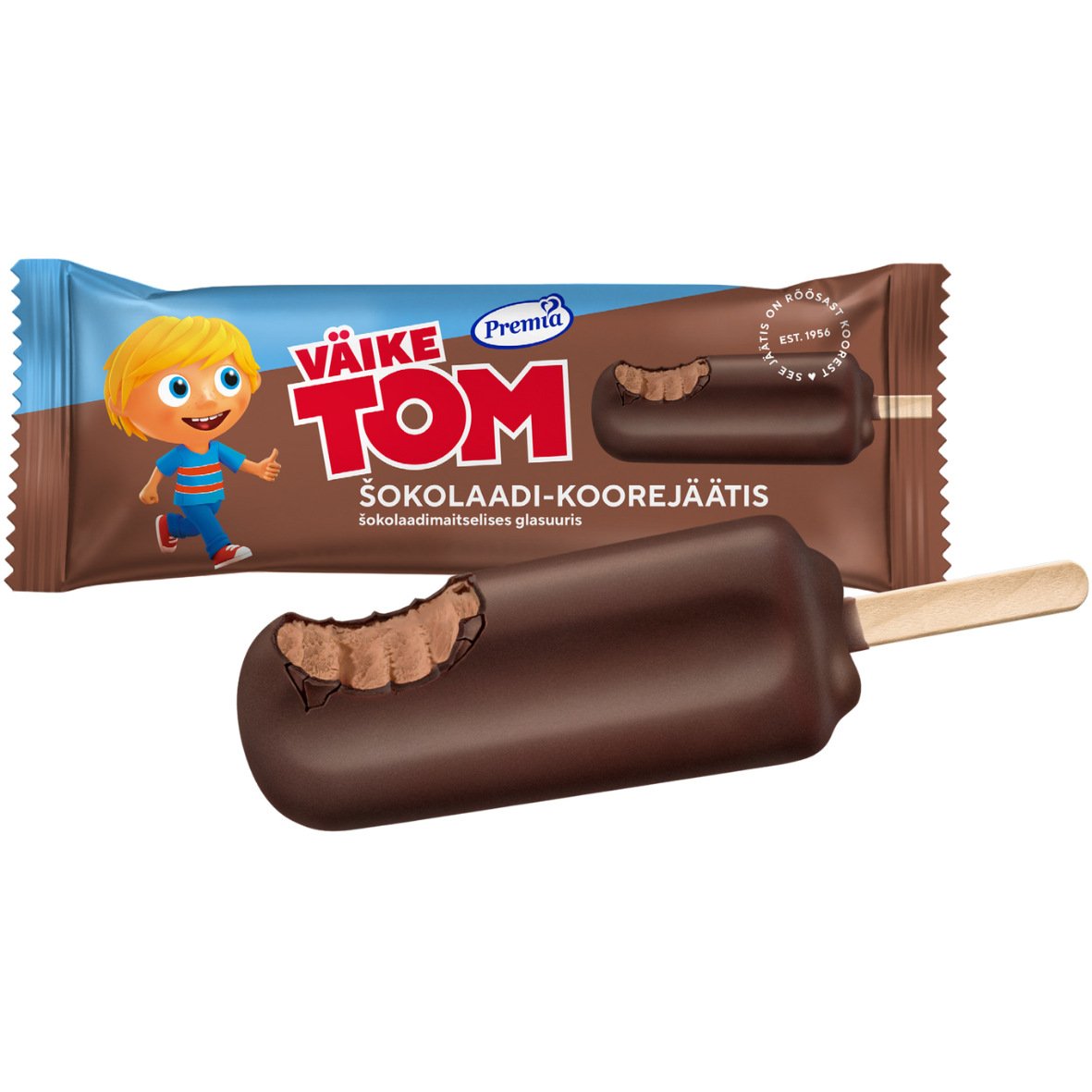 Kaikkien suklaanystävien suosikki on tietenkin Pikku-Tomin herkullinen suklaakermajäätelö, joka on kuorrutettu suklaakuorrutteella. Suklaata suklaan sisällä – erityisen suklainen yhdistelmä. (*PREMIA – sivu)
